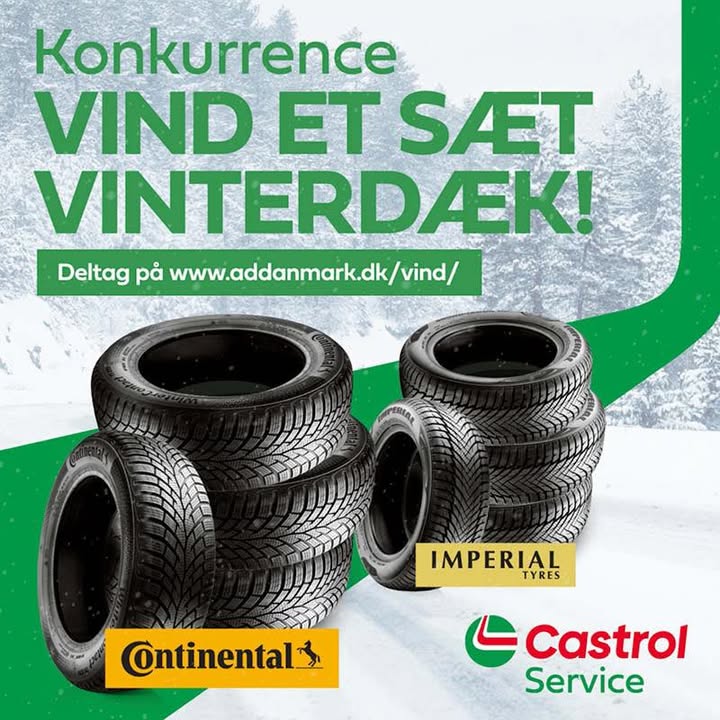 ❄️ Vind et sæt vinterdæk til din bil! 🚗💨 Er du klar til vinterens veje? Resten af oktober har du chancen for at deltage i konkurrencen om at vinde et sæt vinterdæk fra enten Imperial eller Continental! 🛞 🔹 Sådan deltager du: Følg linket i opslaget, indtast dit navn og telefonnummer, og tryk derefter på ’Tilmeld’ – så er du med i konkurrencen om et sæt vinterdæk. 🗓️ Konkurrencen løber frem til 31. oktober, og vinderne trækkes kort efter. Kom ind forbi – og kør vinteren sikkert i møde! ❄️